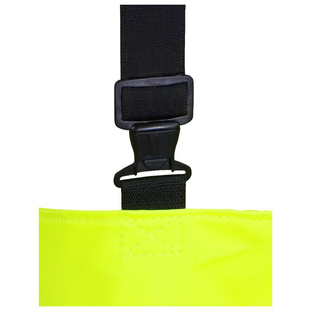 Aus PVC und Polyester mit doppelt verschweißten Nähten, Träger verstellbar durch rostfreie Patent-Schnallen. Das Material gewährleistet eine hohe Flexibilität auch bei niedrigen Temperaturen und bietet durch seine gut sichtbare, leuchtgelbe Farbe mehr Sicherheit für die Einsatzkräfte. Angeschweißte Stiefel nach S5 Standard mit stark profilierten Sohlen, rutschhemmend, Verstärkungsrippen auf dem Schaft, Reflexpunkt an der Ferse und mit durchtrittsicherer Sohle und Stahlkappe.